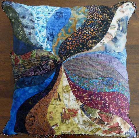 This is a large pillow, 25″ x 25,” commissioned for a young woman. This is my third commission for her. Her mother has remembered her 6th, 12th, and 18th bithdays with original work. Each one reflects who she has become as she has grown. It’s been a lovely journey with her.